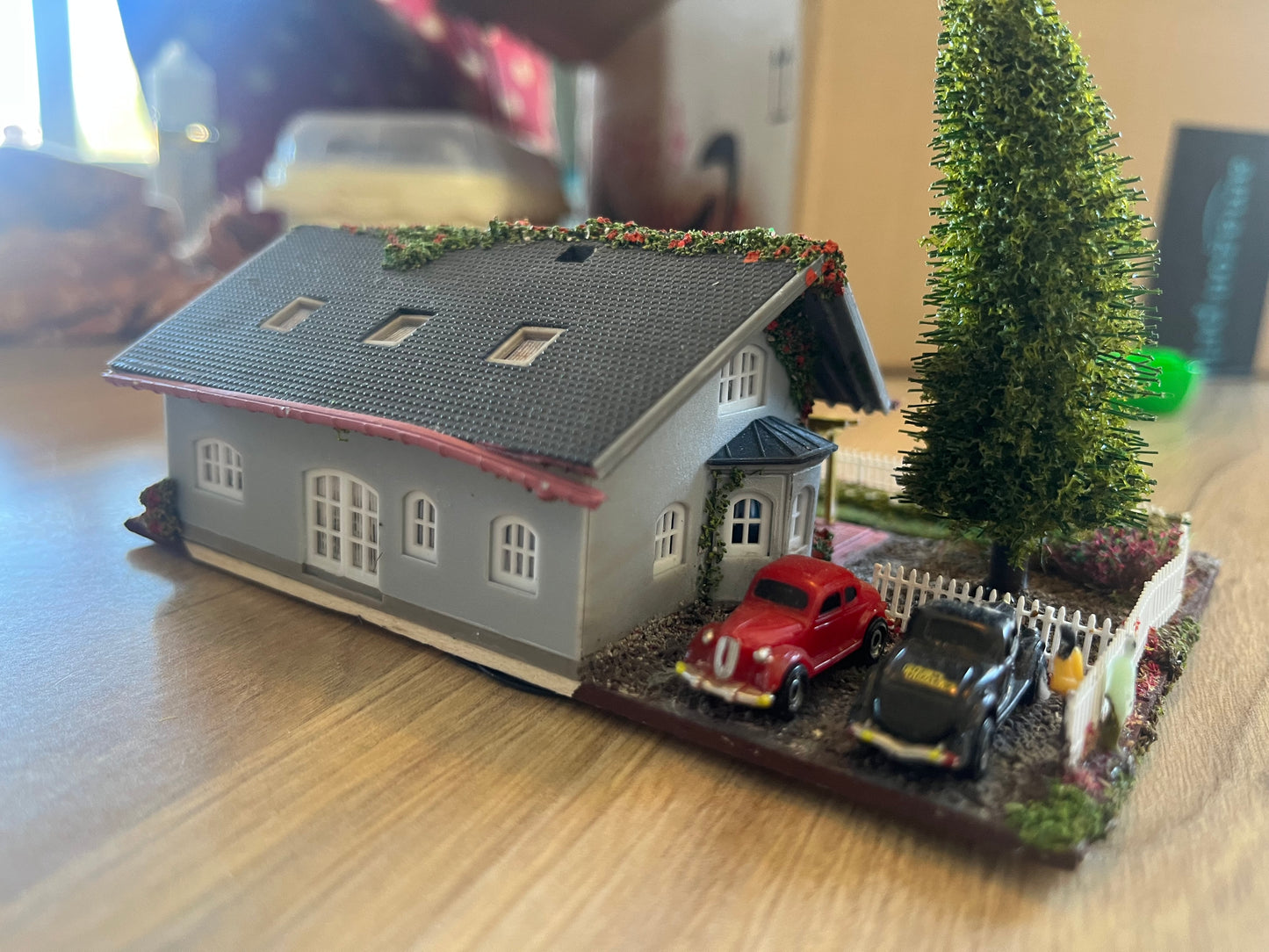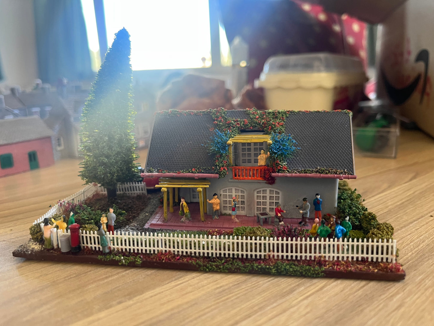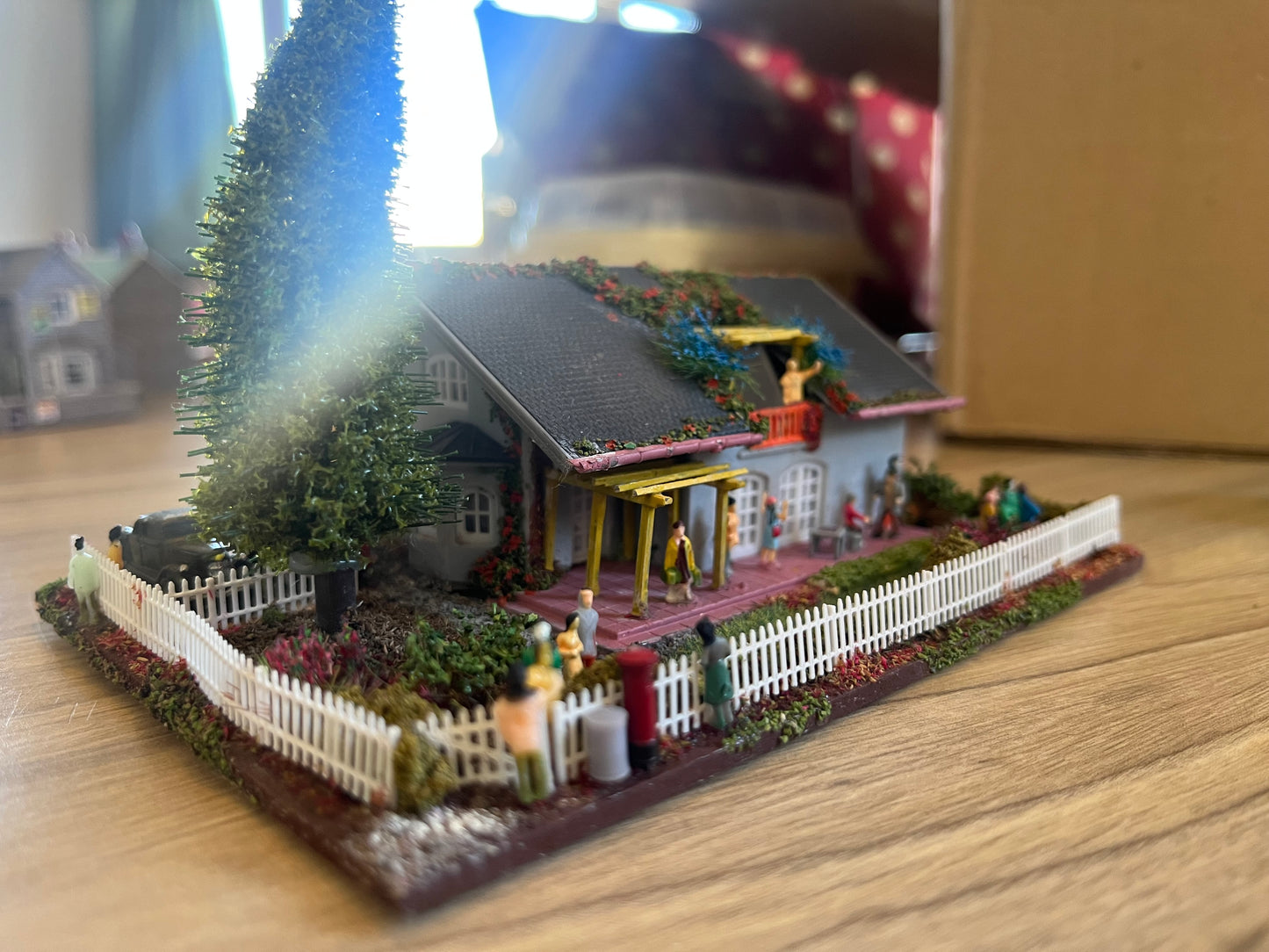 A lovely little diorama ready to go straight in your layout. Best suited to continental theme layout. The Diorama includes. A family having a party in the Garden, x2 cars in the drive. Beautifully done grass, shrubs and flowers, plus trees.