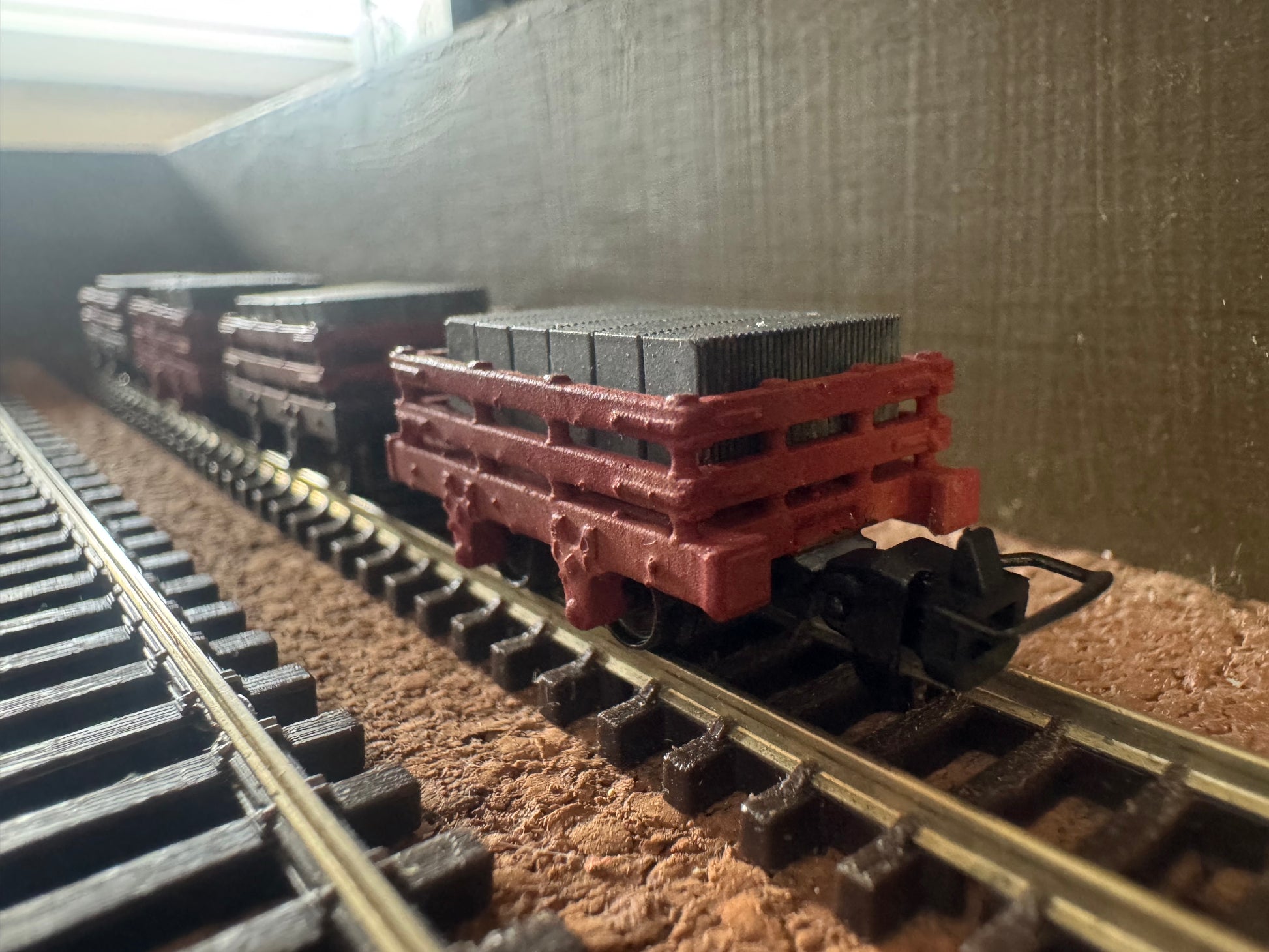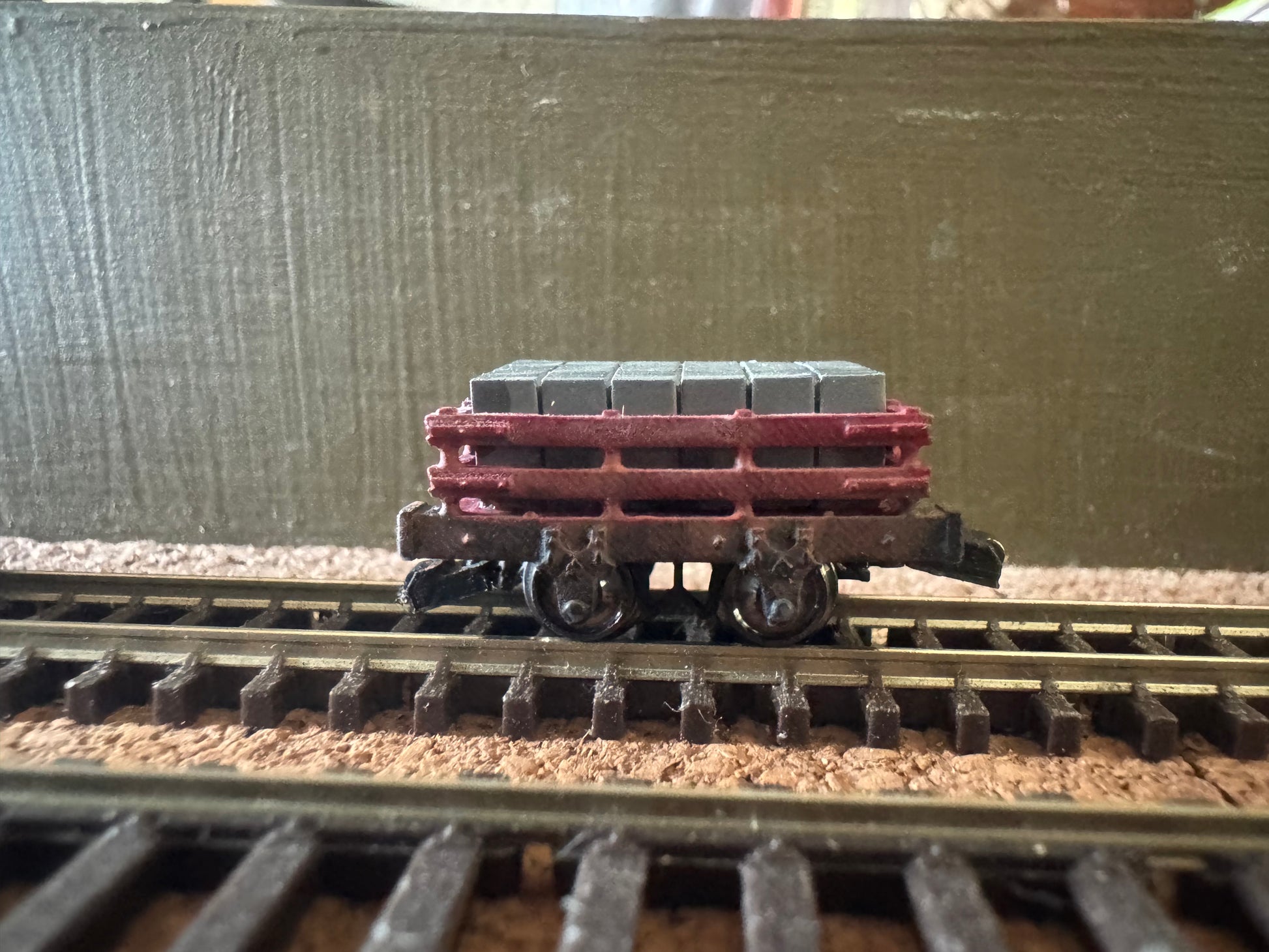 Four nice wagons with load. The wagons have conventional coupling on the ends and magnetic couplings on the middle wagons. The wagons roll okey. Pre-made 3D kits. The Load are fixed in place.